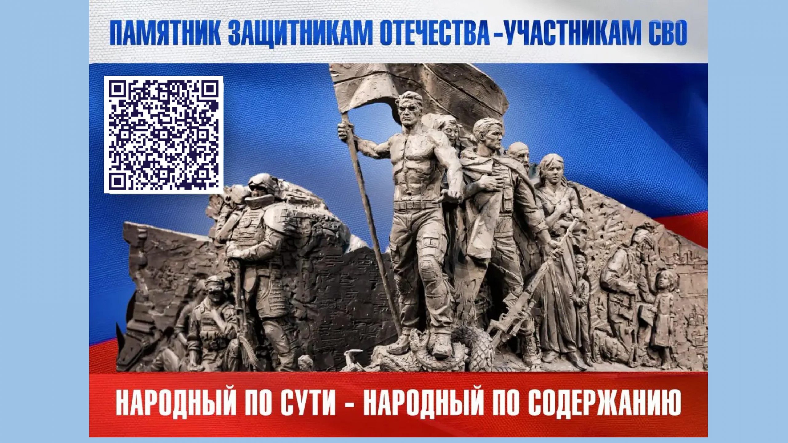 Центр композиции — 12‑метровый образ солдата; рядом — фигуры штурмовика, гранатомётчика, оператора БПЛА, медсестры, снайпера, мирных жителей и девочки с весточкой из дома (отсылка к акции «Тепло из дома»).